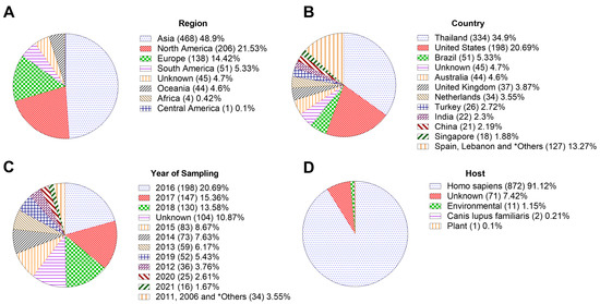 Diversity of K. pneumoniae ST16 isolates included in this study. (A) Distribution by geographic region. (B) Distribution by country of the available genomes. (C) Temporal distribution of isolates. * Others: comprise isolates reported between 2003 and 2022. (D) Hosts or sites of sampling.