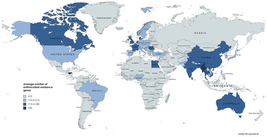 Heatmap illustrating the number of antimicrobial resistance genes per location. Gray: location with no ST16 isolates reported in NCBI. This figure was made using MapChart (https://www.mapchart.net/world.html; accessed on 5 May 2022) and data from 912 isolates for which sampling location was available.
