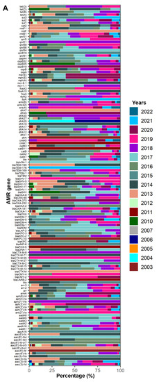 A similar scenario was observed for aminoglycosides, with numbers between 2003 and 2011 varying from two to six genes or variants, and between 2012 and 2021 increasing to 10-18. Thirty-one genes associated with this type of resistance were found, the most common being aac(6′)-Ib-cr5 encoding an aminoglycoside acetyltransferase that also has activity against fluoroquinolones [79,80]. The aac(3)-IVa (n = 10 genomes) and aph(4)-Ia (n = 10 genomes) were identified exclusively in the United States. For quinolones, there was no significant increase in the number of AMR in time, with two to nine genes or variants identified per genome per year during the studied period. Noteworthy was the presence of qnrE1, reported in five isolates from Brazil in 2018. This gene was originally found in a conjugative plasmid in a clinical K. pneumoniae isolate [81]. Also noteworthy are reports of qnrB1 since 2012 in 13 countries but mostly prevalent in the United States (18/45; 40%), and qnrS1, reported since 2013 in 19 different countries but most prevalent in the United States, Australia and Thailand (19/97; 19.58%), (17/97; 17.52%) and (14/97; 14.43%), respectively. Both genes have been found in plasmids [55,56].