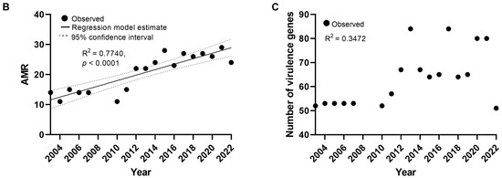 In order to understand how AMR genes are distributed in ST16 isolates worldwide, and if resistance patterns changed in time, we analyzed 912 isolates for which information about the location for sampling was available. A heatmap illustrating the number of antimicrobial resistance genes found per location is presented in Figure 2. According to reported data, the average of number of AMR genes was lower in Pakistan and Hong Kong (≤10) and higher numbers were found in Myanmar, Denmark and Honduras (>20) (Figure 2). For a total of 853 genomes (89.13%) the year of isolation was available, the first ST16 genome having been reported in 2003 and the last one in 2022. A diverse set of AMR genes (Figure 3A) and a significant increase in maximum AMR gene numbers per genome per year were observed (p < 0.0001, R2 = 0.7740) (Figure 3B). On the other hand, the maximum number of virulence genes per genome did not increase over time (R2 = 0.3472) (Figure 3C).