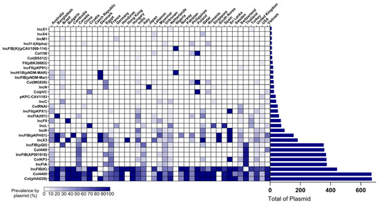 Fifty-nine different plasmid incompatibility groups were detected, with almost 100% of isolates harboring at least one of such structures (949 out of 957 isolates). The most common Inc groups were Col(pHAD28) (673/949; 70.91%), Col440II (971/949; 70.70%), IncFIB(K) (443/949; 46.68%), IncFIA (375/949; 39.51%), ColKP3 (373/949; 39.30%), IncFIB(AP001918) (370/949; 39.98%), Col440I (359/949; 37.82%) and IncFIB(pQil) (355/949; 37.40%) (Figure 4).