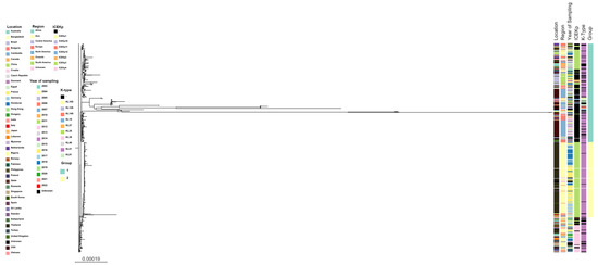 All 957 ST16 K. pneumoniae genomes were annotated using prokaryotic genome annotation pipeline, with default parameters Prokka v1.14.6 [41]. Roary v3.13.0 was used to generate the pan genome profile with a 95% BLAST v2.10.1 identity threshold using the MAFFT v7.475 (https://mafft.cbrc.jp/alignment/software/, created by Kazutaka Katoh, Suita, Osaka, Japan, accessed on 5 May 2022) setting. The core genome was defined as “genes present in at least 99% of genomes” using the 957 gff3 files obtained with Prokka v1.14.6 as previuously described [42]. Recombination sequences were identified and removed from the global core genome alignment with fastGEAR software v.1.0 (https://users.ics.aalto.fi/~pemartti/fastGEAR/, created by Rafal Mostowy, London, United Kingdom, accessed on 5 May 2022) [43,44]. Snp-dists (https://github.com/tseemann/snp-dists, created by Torsten Seemann, Melbourne, Australia, accessed on 5 May 2022) was used to create a pairwise SNP distance matrix from the core gene alignment. The median nucleotide divergence of core genes analyzed was calculated by taking median pairwise SNP differences and dividing by total length of the core genome minus ambiguous characters [45]. IQ-TREE-v2.2.0 (http://www.iqtree.org/, created by Bui Quang Minh, Vienna, Austria, accessed on 5 May 2022) was used to create a Maximum likelihood based on the core genome defined using Roary [46]. ModelFinder identified the best nucleotide substitution (GTR+F+I+I+R5 model with a rate heterogeneity ‘FreeRate’ (http://www.iqtree.org/, created by Subha Kalyaanamoorthy, Edmonton, Alberta, Canada, accessed on 5 May 2022) [47]. Bootstrapping was done 1000 times with ultrafast bootstrap (UFBoot) (http://www.iqtree.org/, created by Diep Thi Hoang, Hanoi, Vietnam, accessed on 5 May 2022). The tree was visualized using Microreact v.218 (https://microreact.org/, created by Silvia Argimón, Hinxton CB10 1SA, United Kingdom, accessed on 5 May 2022) [48].