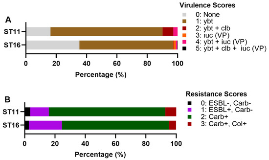 Distribution of (A) virulence and (B) resistance scores among genomes belonging to ST11 and ST16. Ybt: yersiniabactin, clb: colibactin, iuc: aerobactin, VP: virulence plasmid, ESBL: Extended Spectrum-β-Lactamase, Carb: carbapenemase, Col: colistin resistance determinant.