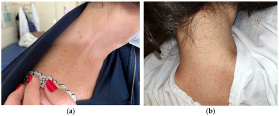 Dermanyssus provoked multiple, reddish and itchy papules. (a) Patient 1, base of the neck; (b) Patient 2, back of the neck.