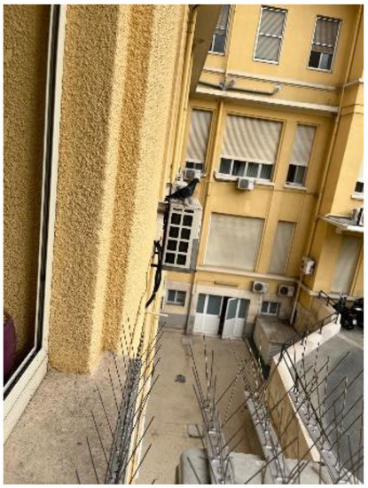Our experience confirms that dermanyssosis outbreaks are common, particularly when there are incorrect or unsuitable structural interventions (e.g., crevices and niches on facades and roofs). Air conditioning external units can also contribute to the problem; in fact, they provide pigeons with an excellent place to build their nests (Figure 2).