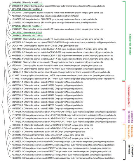 Dendrogram obtained via a phylogenetic analysis of OmpA gene sequences of representatives of the genus Chlamydia. The sequences were obtained from the GenBank and MLST (http://pubmlst.org/chlamydiales/, accessed on 15 August 2022) websites. Multiple alignments were made with the help of the Clustal W algorithm [], and phylogenetic analysis was performed with the MEGA 11 software using the Neighbor-Joining method. The isolates obtained in this study are underlined in green.