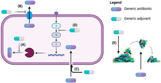 | Mechanism of Action | Type of Adjuvant | Examples of Adjuvants | Antibiotic Potentiated | Commercial Combination | Reference |