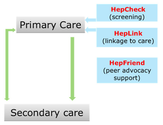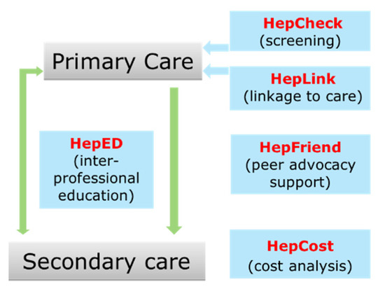 - Avramovic, G.; Reilly, M.; Cullen, W.; Macías, J.; McCombe, G.; McHugh, T.; Oprea, C.; Story, A.; Surey, J.; Sabin, C.; et al. HEPCARE EUROPE—A case study of a service innovation project aiming at improving the elimination of HCV in vulnerable populations in four European cities. Int. J. Infect. Dis. 2020, 101, 374–379. [Google Scholar] [CrossRef] [PubMed]