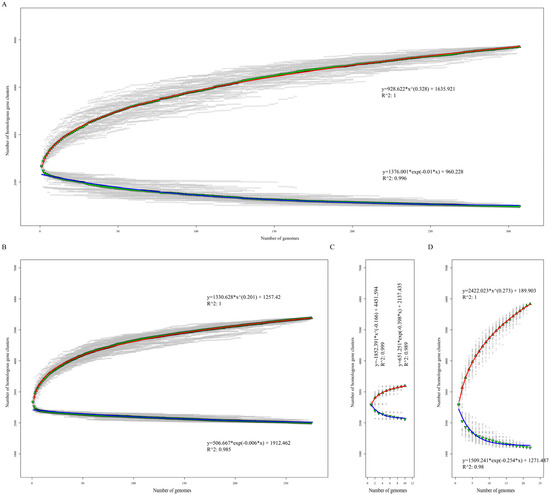 where y is the pan-genome size; x is the number of the genome; and A2, B2, and C2 are free parameters.