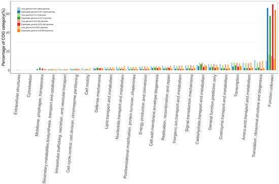 For the core and accessory genome gene sets of each Listeria group, EggNOG v5.0 and the Clusters of Orthologous Groups database (COGs, 2020 update, https://www.ncbi.nlm.nih.gov/research/cog/, accessed on 9 September 2022) were used to perform the functional annotation and categorization, and the results were integrated [23,24]. The percentage of each COG function category of each Listeria group gene set was shown in a bar chat. Moreover, the Virulence Factor Database (VFDB), TrEMBL, and InterProScan were used to predict the functions of the genes and served as a complement to the annotation [25,26].