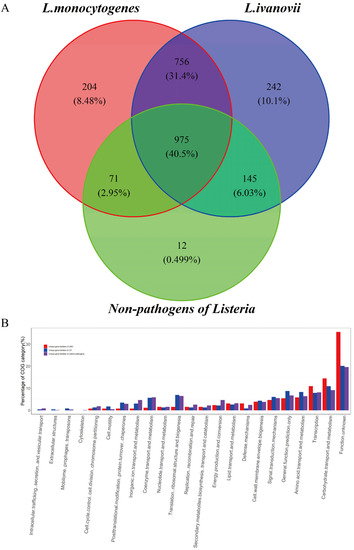 Function categories of the unique gene families of LMO, LIV, and both. (A) The Venn diagram for the gene sets of L. monocytogenes, L. ivanovii, and non-pathogens of Listeria. The number and proportion of the gene families are shown in the graph. (B) Function categories of the unique gene sets of LMO, LIV, and both according to the COG and EggNOG databases. The COG categories of 204 LMO unique genes, 242 LIV unique genes, and 756 genes that were shared by LMO and LIV but absent in NPLS are shown in the graph with different colors, respectively.