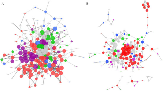 The protein–protein interaction network analysis of unique gene families of the LMO and LVI genomes. The PPI network of LMO (A) referenced to L. monocytogenes EGD-e 169963 and the names of the nodes corresponding to Table S3. The PPI network of LMO (B) referenced to L. ivanovii 1638 and the names of the nodes corresponding to Table S4. Only those networks with a number of nodes greater than 3 are shown in the graph. The edges of the network represent the relationships of protein–protein interaction, and their line thickness represents the confidence of the relationships between nodes. The size of the nodes represents the degree of the nodes. Different colors of the nodes reflect the different protein function categories: the red represents basic substance transport and metabolism; the purple represents genetic information processing, including replication, transcription, and translation; the blue represents the cellular processes, including cell wall/membrane/envelope biogenesis and cell motility; the green represents the bacteria–environment interaction, including signal transduction, extracellular structures, and defense mechanism; and the grey represents the proteins without meaningful function annotations.
