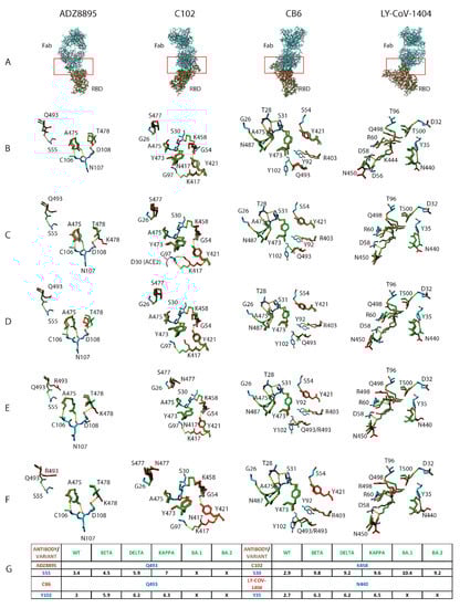 Interaction of ADZ8895, C102, CB6, and LY-CoV-1404 antibodies with SARS-CoV-2 variants of concern (VOC) RBD proteins. Structural alignment of the original RBD protein (green sticks) with the VOC RBD proteins (red sticks) in complex with various monoclonal antibodies (element sticks) (A). Comparison of the structural positioning of corresponding epitope amino acids in the original RBD protein (green sticks) with the Beta (B); Delta (C); Kappa (D); BA1 (E); and BA2 (F) RBD proteins (red sticks). Red boxes and dotted yellow lines represent the paratope-epitope interface and hydrogen bonds, respectively. Distance in Angstroms (black, X represents mutations) between interacting AASCs (blue) on VOC RBD (green) and antibody (red) paratopes (G).