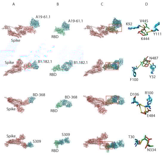 Interaction of A19-61.1, B1.182.1, BD368, and S309 antibodies with SARS-CoV-2 spike and RBD proteins. Antibodies in complex with the spike protein (red sticks) (A) and the RBD protein (green sticks) (B). Structural alignment of the spike protein against the RBD protein in complex with various antibodies (element sticks) (C). Comparison of the structural positioning of AASCs in the spike protein (red sticks) with corresponding AASCs in the RBD protein (green sticks) (D). Hydrogen bonds are depicted as dotted yellow lines while red boxes represent the paratope-epitope interface.