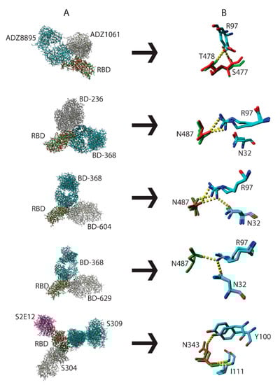 Antibody-RBD binding can use either the “lock and key” or “handshake” mechanism [22,23]. The “handshake” or “induced-fit” mechanism requires paratope and epitope AASCs to spatially readjust for optimal binding to occur. Cocktail and individual antibody-bound RBD proteins (Table 1) belonging to the same SARS-CoV-2 variant RBD were structurally aligned (Figure 3A). In Figure 3B we show that R97 on the ADZ8895 antibody interacted with S477 (RBD) when used as a cocktail but interacted with T478 (RBD) when used individually. Mixing antibody BD-368 with either antibodies BD-236, BD-604, or BD-629 resulted in three distinctive hydrogen bond interactions in their paratope-RBD interfaces (Figure 3B). For example, N487 in the BD-368/BD-236 cocktail forms two hydrogen bonds with R97 when used as a cocktail but only a single hydrogen bond when utilized individually. When the combination is changed to BD-368/BD-604 the interactions with R97 are maintained but N32 is additionally engaged. Finally, all hydrogen bonds are lost when the BD-368/BD-629 cocktail is used. This underpins the significance of minor structural perturbations in influencing the formation or disruption of optimal paratope-epitope interactions and could, potentially, result in variations in functional activity. To explore the generalizability of these observations, Ebola virus glycoproteins belonging to the same strain in a complex with either a cocktail of C13C6 and C2G4 or C13C6 and C4G7 antibodies were structurally aligned. We show that the swapping of antibody pairs resulted in the disruption of hydrogen bonds (Figure S4A–C; C13C6). We also structurally aligned RBD proteins belonging to the same SARS-CoV-2 variant in complex with either an individual ACE2 protein or a cocktail of ACE2 with S304 and S309 antibodies. We show that the amino acid D38 on ACE2 interacted with the atom NH1 of R498 on RBD when reacted individually and with the atom NH2 when used as a cocktail (Figure S4B; ACE2). We show the presence of a hydrogen bond between S19 (ACE2) and N477 (RBD) in a cocktail of ACE2, S304, and S309 but not when ACE2 was used individually (Figure S4C; ACE2). A possible explanation could be that antibodies in cocktails do not bind simultaneously to their antigens indicating that a higher affinity antibody might bind first followed by antibodies with low affinity. In this case, induced-fit may cause minor structural distortions of RBD AASCs which will subsequently influence how well the second antibody in the cocktail will interact with the epitope.
