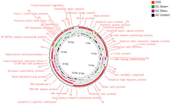 - Structural and packaging proteins: Sixteen ORFs were predicted to encode for structural proteins such as portal protein, head protein, putative tail protein, a scaffold protein, putative major capsid protein, Ig-like domain-containing protein, head-to-tail connector complex protein, putative tail protein, tail protein, tail assembly chaperone, putative tape measure protein, minor tail protein, putative tail protein, tail_spike_N domain-containing protein, and 13.88 kDa late protein. ORF 1 and ORF 75 were predicted to encode for terminase large and small subunits, respectively.