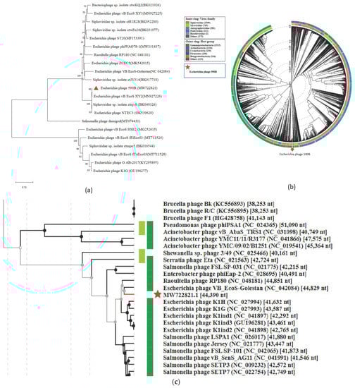 - Nishimura, Y.; Yoshida, T.; Kuronishi, M.; Uehara, H.; Ogata, H.; Goto, S. ViPTree: The Viral Proteomic Tree Server. Bioinformatics 2017, 33, 2379–2380. [Google Scholar] [CrossRef]