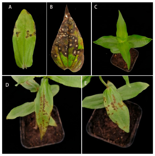 (A,B) Field symptoms of zinnia leaf spot disease. Healthy plants that were (C) inoculated with sterile water and (D,E) plants presenting symptoms on leaves due to inoculation with BRJ2 after 7 d.