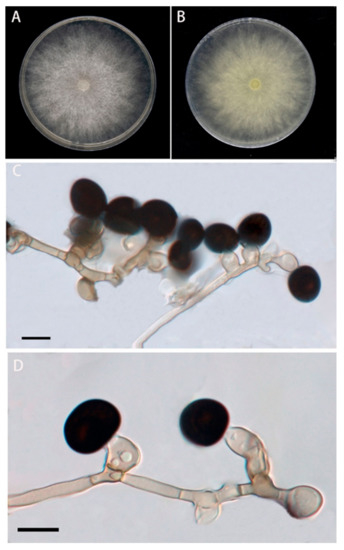 Morphological characteristics of the BRJ2 isolate on PDA after seven days. (A) Front of a BRJ2 colony; (B) back of a BRJ2 colony. (C,D) Conidiogenous cells giving rise to conidia. (C,D) Scale bar = 10 μm.