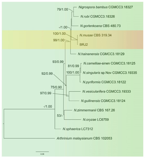 Maximum likelihood (ML) tree of Nigrospora spp. based on 13 strains. Maximum likelihood analysis bootstrap support (ML ≥ 50%) and Bayesian posterior probability (PP ≥ 0.90) are shown at the nodes (ML/PP). The tree was rooted using Arthrinium malaysianum (CBS 102053). The scale bar indicates 0.08 expected changes per site.