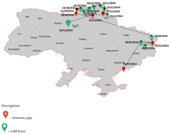 - Glebenyuk, V.V.; Glebenyuk, O.G.; Petrusha, V.G. The African swine fever spread in Ukraine. Sci. Messenger LNU VMB 2017, 19, 92–95. [Google Scholar]