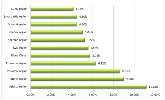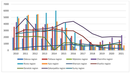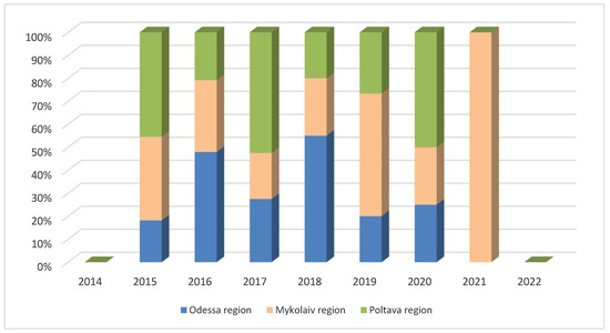 A significant proportion of African swine fever outbreaks were recorded in the Odessa region between 2016 and 2018, as well as in the Poltava region in 2015, 2017, and 2020, as well as in the Mykolaiv region in 2019 and 2021 (Figure 4).