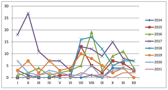 It has been observed that ASF in Ukraine is characterised by seasonality (Figure 5), with the highest outbreak incidence observed between summer and autumn, except in 2017 when the highest number of outbreaks was registered in winter. The potential sources of infection may be related to the increased activity of farmers and the application of agricultural machines in the area of the ASFV’s presence in contaminated fields. Others might be related to the application of ASFV-contaminated feed from not registered ASF outbreaks.