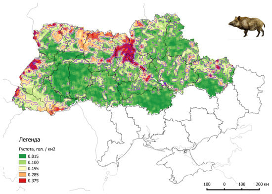 Density of the wild boar population on Ukrainian territory (2022, source: www.asf.vet.ua accessed on 15 October 2022).