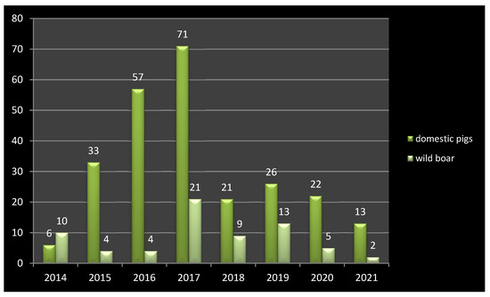 Analysing the data, it was found that the highest number of outbreaks in domestic pigs was observed in pig farms (more than 50%), showing a low level of biosecurity and a lack of awareness of the owner in the context of the threat of ASF.