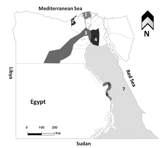 Map of Egypt showing the governorates where samples were collected. Areas with different colors refer to the investigated governorates, 1; Kafr Elsheikh, 2; Alexandria, 3; Giza, 4; Cairo, 5; Qena, 6; Luxor, 7; Red Sea.