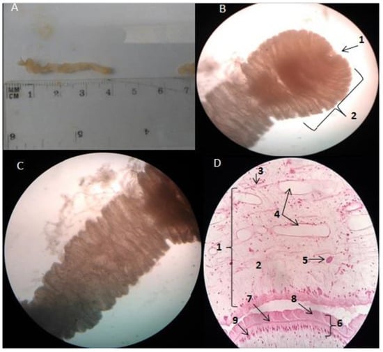 Plerocercoid larvae of Spirometra spp. (A) Gross appearance, 40 mm length × 5 mm width. (B) Anterior end: 1 bothrium, 2 primitive scolexes (40X). (C) Pseudo-segmented body (40X). (D) Microphotograph of a section of the parasite 1. Parenchyma, 2. Loose stroma, 3. Mesenchymal fiber, 4. Excretory channels, 5. Calcareous corpuscle, 6. Body wall, 7. Longitudinal muscle fibers, 8. Tegument, 9. Row of tegumentary cells (400X).