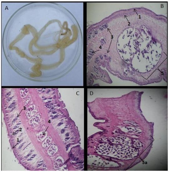 (A) Gross picture of an adult Spirometra spp., (B) Cross section of a gravid proglottid containing the central field, (C) Parasagittal section containing lateral field: 1. Acellular tegumentary layer, 2. Cellular tegumentary layer, 3. Vitellogenic glands, 4. Testes; (D) Horizontal section with: 5a. Spirally coiled uterus with four and a half convolutions. (Microphotographs B–D stained with HE/100×).