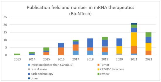 The number and field of paper publication in mRNA therapeutics by year by BioNTech.