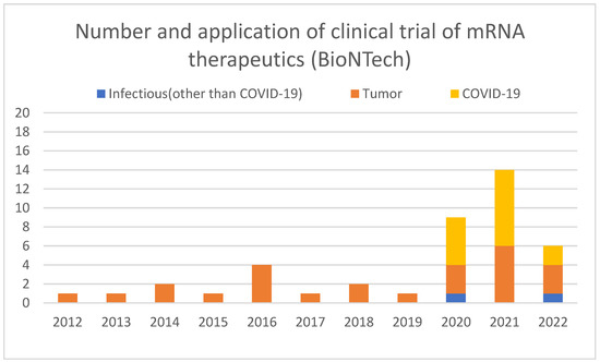 The number and application of clinical trial of mRNA therapeutics by year by BioNTech.