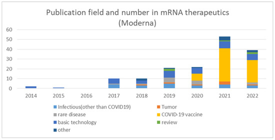 The number and field of paper publication in mRNA therapeutics by year by Moderna.
