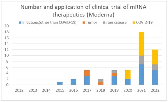 Looking at patent applications, applications began in 2010, when the company was founded, with the largest number of applications in 2013, followed by a decline in the number of applications, and once reached zero in 2016 (Figure 2). This suggests that Moderna had filed patents on mRNA vaccine technology for clinical trials roughly by 2015 and had moved from research to the clinical development phase (Figure 5). Until 2019, the largest number of clinical trials were for infectious diseases other than COVID-19. Clinical trials for tumors and rare diseases were also initiated. Clinical trials for the COVID-19 vaccine began in 2020 and continued until 2022. The COVID-19 vaccine accounted for the largest proportion of the number of clinical trials until 2022. It can be seen from their publication that Moderna already had experience with mRNA vaccines as infectious disease vaccines at the time of COVID-19’s emergence. In 2017, Moderna published the results of a clinical trial against the influenza virus [61]. As of 2021, mRNA vaccine trials against infections other than COVID-19 are being conducted with 18 compounds, 17 in phase 1 and 1 in phase 2, 13 of which are Moderna’s compounds [62]. These data show how experienced Moderna was in the clinical development of mRNA vaccines against infectious diseases other than COVID-19. It is strongly inferred that Moderna had already established its expertise in vaccine development at the time of pandemic emergence through the development of technologies related to mRNA structure, delivery, and manufacturing, as well as the clinical development of mRNA vaccines, especially vaccines against infectious diseases.