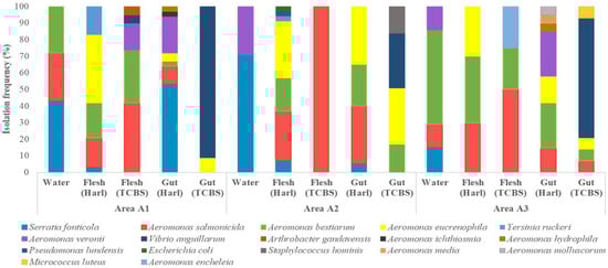 The results of the identification of the isolated bacteria via MALDI-TOF MS analysis were acceptable only when the acquired identification score value was >2000, and they are presented in Figure 1. Overall, Serratia fonticola and several species belonging to the genus Aeromonas (e.g., Aeromonas salmonicida, Aeromonas bestiarium, Aeromonas veronii, etc.) exhibited by far the highest isolation frequencies in all studied samples, while the microbiota profile between the three studied areas was similar within the majority of the studied parameters (water, flesh and gut). For instance, in water samples the high presence of S. fonticola was profound in all three areas (dominant in areas A1 and A2), while the isolation frequency of both A. salmonicida (in areas A1 and A3) and A. veronii (in areas A2 and A3) is also noteworthy. It is crucial to point out the highest isolation frequency (57%) of A. bestiarium in the water of area A3. The latter species was also present in samples from area A1 at relatively high frequency (28%). In addition to water samples, a similar microbial profile was also observed in fish flesh samples from the three studied areas, with A. eucrenophila, A. salmonicida and A. bestiarium being the most representative species, while the presence of Yersinia suckeri in flesh from areas A1 and A2, as well as that of Aeromonas enheltia in flesh from area A3, should be also highlighted. The same bacteria were included in the main microbial repertoire of the gut samples from all areas, even though Vibrio auguillarum exhibited the highest isolation frequency in all gut samples. Finally, it should be underlined that Micrococcus luteus has been solely isolated from the gut samples of area A3.