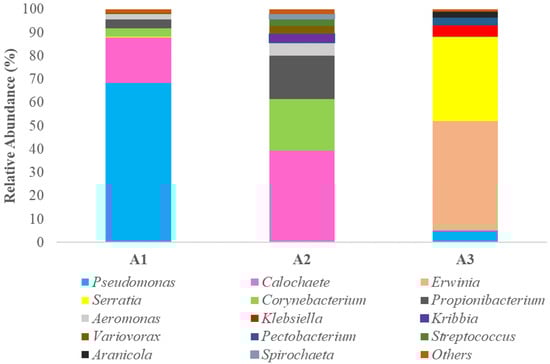 Furthermore, a completely different bacterial profile between samples was observed at genus level (Figure 2). More specifically, in sample KARL_A1, Pseudomonas (68.4%) was the most abundant bacterial group, while the presence of Calochaete (19.3%) is also noteworthy. However, the latter was the most dominant bacteria genus in sample KARL_A2 (39.2%), while the abundance of Corynebacterium, Aeromonas and Propionibacterium was more limited. In the third sample (KARL_A3) Erwinia and Serratia co-existed (46.9% and 35.8%, respectively) representing the dominant microbiota, while Pseudomonas and Klebsiella were found in traces.