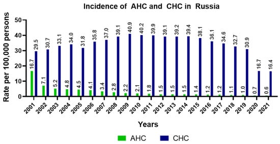 To estimate the incidence of AHC and CHC in Russia, we analyzed the official statistical data from 2001 to 2021 [36]. The analysis included the incidence of AHC and CHC in different age and sex groups.
