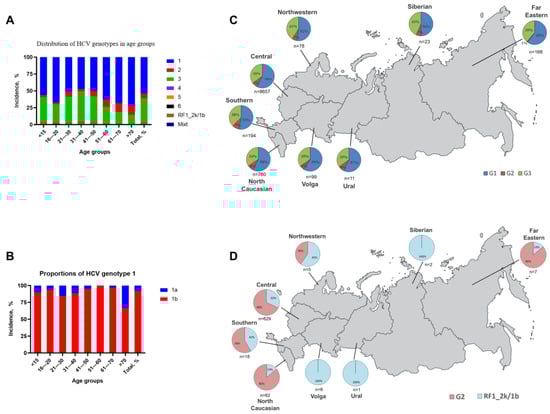 Molecular epidemiology of HCV in Russia. (A) Prevalence of HCV genotypes, recombinant, mixed genotypes, and (B) subgenotypes in different age groups. (C) Geographic distribution of HCV genotypes and (D) RF1_2k/1b recombinant.