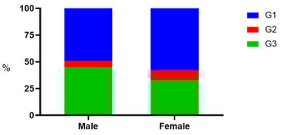 The prevalence of HCV genotypes 1, 2, and 3 differed among gender and age groups (p < 0.05; Figure 2A,B and Figure 3, Table S1). The ratio of HCV genotypes 1, 2, and 3 was 49%, 6%, and 45% in men and 58%, 9%, and 33% in women, respectively (Figure 3, Table S1).