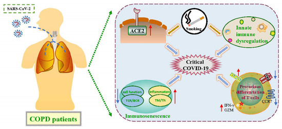 This review aims to examine several aspects, including innate immune dysregulation, angiotensin converting enzyme 2 (ACE2) expression, smoking, precocious differentiation of T lymphocytes, and immunosenescence in COPD patients, which may contribute to poor outcomes after infection with SARS-CoV-2.