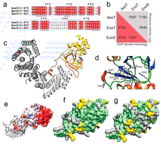 To explore the phylogenetic relationship within this clade of ART toxins for new insights into AexT functions, we constructed a homology model of the ART domain of AexT based on our recent crystal structure of the 14-3-3β:ExoT ART domain complex [28]. The quality of the model is good, with 2% of side chains in disallowed regions of the Ramachandran plot and an overall quality score of 0.68 determined by the QMEAN server [29] (Figure S1a in the Supplementary document). The model aligns with a root mean square deviation of 1.4 Å over all Cα-atom pairs with a model produced by AlphaFold [30] (Figure S1b). A heterotrimer model of AexT with the 14-3-3β homodimer is illustrated in Figure 1c. The signature motif of toxins in this clade, the conserved R-S-E triad [21] within the dinucleotide binding site, is in the expected position in our model (residues R306, S364, E403 of AexT; Figure 1d). Additionally, the surface of the AexT model shares the hydrophobic surface features in the 14-3-3 binding site with ExoT and ExoS (Figure 1e) [28].