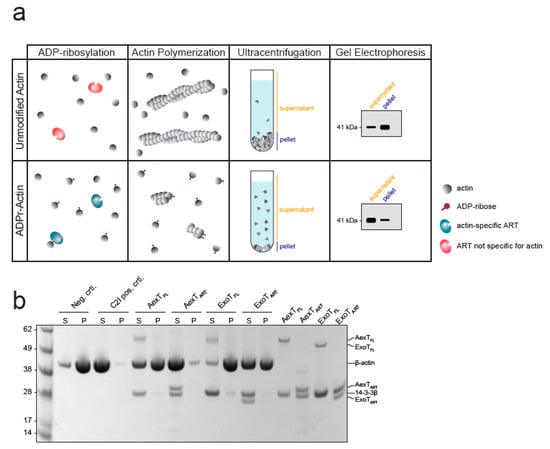Modification of actin has not been reported for ExoT, to the best of our knowledge. Therefore, we explored this observation further. When incubated with cell lysates, ExoT as well as AexT and C2I modified a protein with a mobility in SDS-PAGE indicative of actin (Figure 6). All ADP-ribosylating toxins analyzed so far modify actin at residue R177 [43] and AexT is no exception [20]. ADP-ribosylation at R177 is known to block actin polymerization [44]. To test the effect of AexT and ExoT on the extent of actin polymerization, we conducted a sedimentation assay that is illustrated in Figure 7a. While actin ADP-ribosylation by C2I abolished actin polymerization, ADP-ribosylation by both AexT and ExoT led to partial inhibition of polymerization (Figure 7b). AexT and ExoT ART domain constructs were more efficient than the respective full-length proteins in preventing actin polymerization. This can likely be explained by the fact that actin ADP-ribosylation competed with automodification only in the case of the full-length exotoxins (Figure 5a,b). Nevertheless, these results show that AexT mediated ADP-ribosylation of actin compromises actin polymer formation. Furthermore, they suggest that ExoT can ADP-ribosylate actin on the same target residue as AexT and toxins from other clades.
