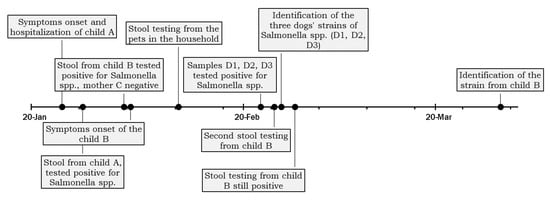 Two weeks after the diagnosis from Child A, the local health authority arranged for the sampling of all domestic animals’ faeces living in the same household. Stool samples were drawn from four dogs (D1, D2, D3, and D4) and one rabbit (D5) that lived mainly in the courtyard but could also access the house, with frequent and close contact with the family. The dogs had not been treated with antimicrobials in the previous year, according to the children’s mother. The declared food habits of the dogs included dry food and human meal leftovers. The animals were fed in the courtyard, and children were only occasionally in contact with the animals’ feed, but had free access to the bowls. The timeline of events is reported in Figure 1.