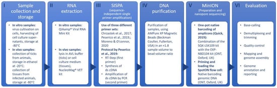 However, one of the crucial steps usually required for NGS is the enrichment of the viral genomes in samples prior to sequencing. In this context, “sequence-independent single primer amplification” (SISPA), a method based on nonspecific amplification using random primers [11], represents a universally applicable and already proven approach for NGS. SISPA was first developed by Reyes and Kim (1991). The first step of it is a reverse transcription, where random hexamers labeled with a known specific sequence are directly incorporated into the cDNA. After denaturation, annealing and double-strain synthesis (Klenow reaction), the yielded dsDNA is amplified using the second SISPA primer consisting of the corresponding known specific sequence without the random hexamers. Hence, it allows the enrichment of the viral genome without the need for virus-specific primers [12,13,14]. Although the output generated by SISPA is generally lower compared to a virus-specific whole-genome PCR, the variable application range poses a major advantage. Thus, this enrichment method is particularly suitable for sequencing viruses originating from different genera, requiring relatively little effort. So far, SISPA in combination with MinION nanopore sequencing (TGS) has only been performed for a limited number of viruses, e.g., canine distemper virus [15], enteroviruses [16], African horse sickness virus [17], Jingmen tick virus and Crimean–Congo hemorrhagic fever orthonairovirus [18].