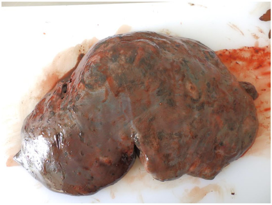 F. magna-positive red deer liver. Note: loss of translucency, traces of iron-porphyrin, and irregular surface due to underlying pseudocysts.