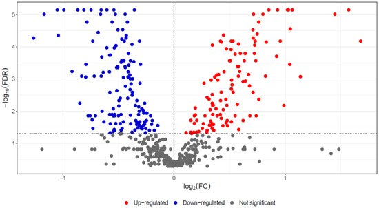 In liver samples of red deer, 550 master proteins were identified and quantified by a label-based quantitative proteomic approach, according to set criteria (two unique peptides and 1% FDR). After the exclusion of proteins with more than 50% missing values, significant differences in abundances between the F. magna-infected and control groups were assessed by the Mann–Whitney test (FDR < 0.05) and were found for 234 proteins (Table 2, Supplementary Table S1). Of those, 123 had higher abundance, and 111 had lower abundance in the F. magna-infected group compared to the control group, as depicted in the below volcano plot (Figure 2). Selected proteins with the highest fold change differences are also presented as heat map (Figure 3).