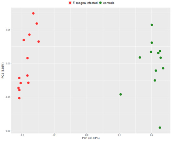 Principal component analysis (PCA) score plot showing the distribution of samples from control (green dots) and F. magna-infected (red dots) groups.