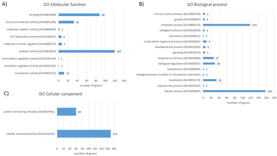 Protein accession IDs were matched to 231 unique gene IDs for the functional analysis of differentially abundant proteins. According to PANTHER GO Slim analysis, liver proteins with significant differences in abundances within the control and F. magna-infected groups were involved in cellular processes (158 genes, 56.4%), metabolic processes (119 genes, 42.5%), biological regulation (30 genes, 10.7%), response to stimulus (27 genes, 9.60%), and others (Figure 5B).